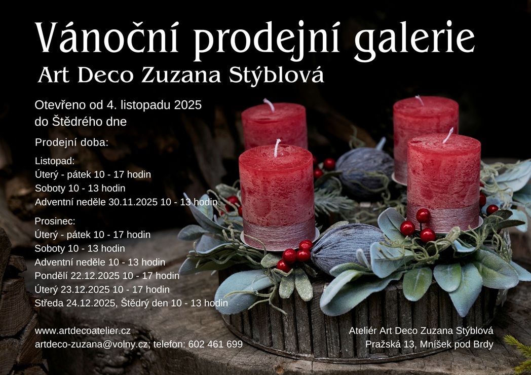 Art Deco Ateliér sídlí pár kroků od náměstí F. X. Svobody v Mníšku pod Brdy. Přijedete-li autem, můžete zde pohodlně zaparkovat na neplaceném parkovišti (ve všední dny a sobotu dopoledne na max. dvě hodiny). Přijedete-li do Mníšku autobusem PID, výstupní stanice Mníšek pod Brdy náměstí je 50 metrů od našeho vchodu.